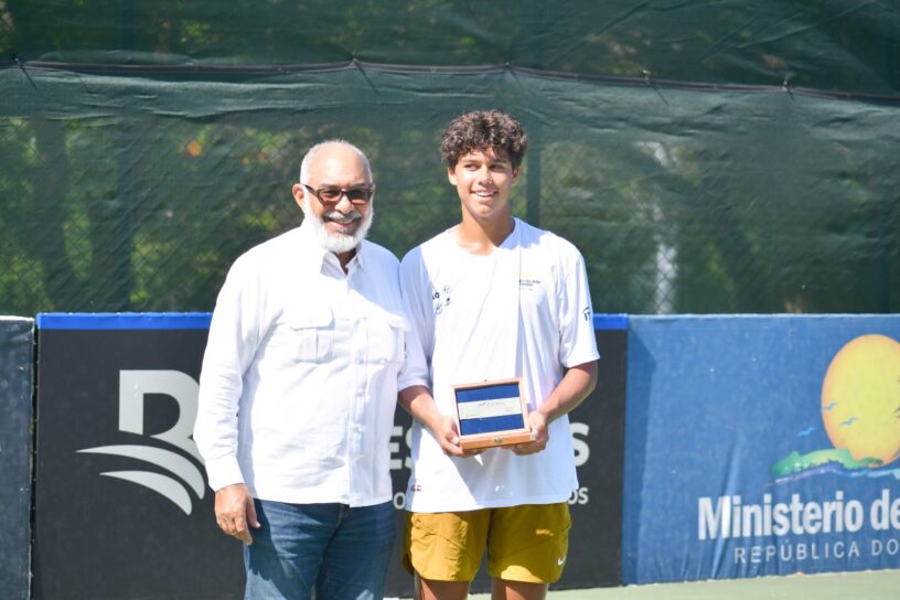 Yannik Álvarez, campeón de sencillos de la Copa Caribe, premiado por Persio Maldonado, presidente de Fedotenis.