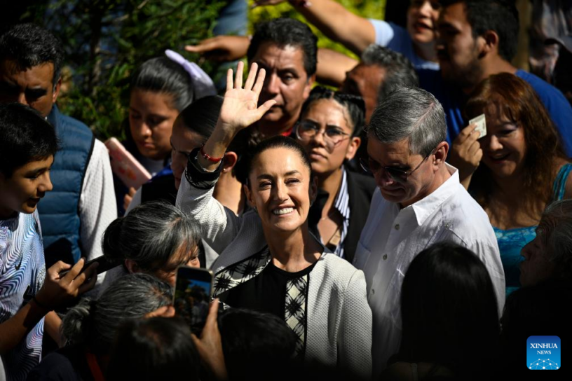 La candidata a la Presidencia de México por la coalición Sigamos Haciendo Historia, Claudia Sheinbaum (c), saluda tras emitir su voto en una casilla electoral durante las elecciones generales, en San Andrés Totoltepec, en la Ciudad de México, capital de México, el 2 de junio de 2024. La autoridad electoral de México dio inicio el domingo al mayor proceso electoral en la historia del país, en el que los mexicanos elegirán a varios representantes incluido un nuevo presidente. (Xinhua/Li Muzi)