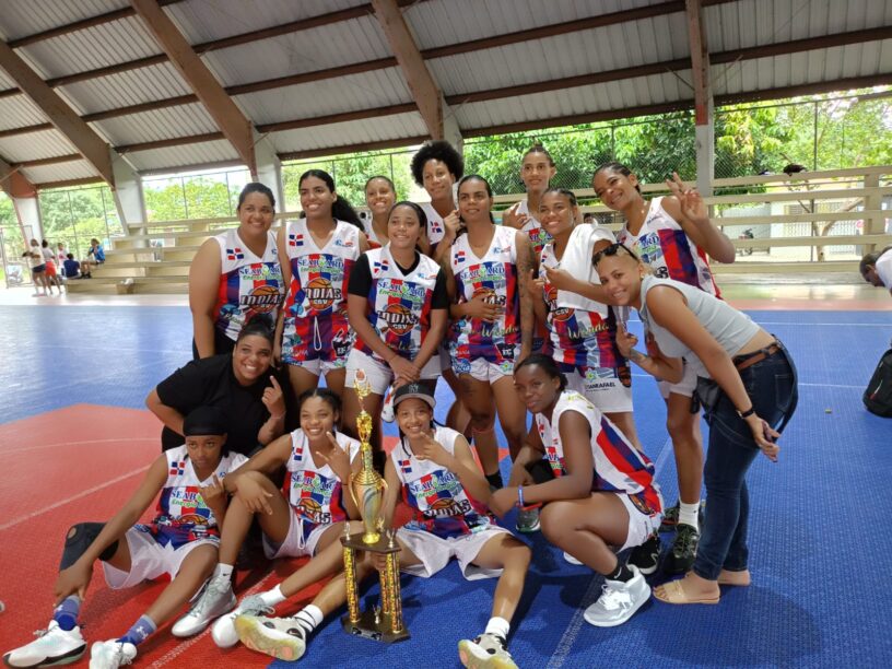 Equipo de las Indias del club San Vicente reciben la copa Centro clínico dental Plamed como campeonas del primer torneo de baloncesto superior femenino del Cibao Piedra Blanca 2024.