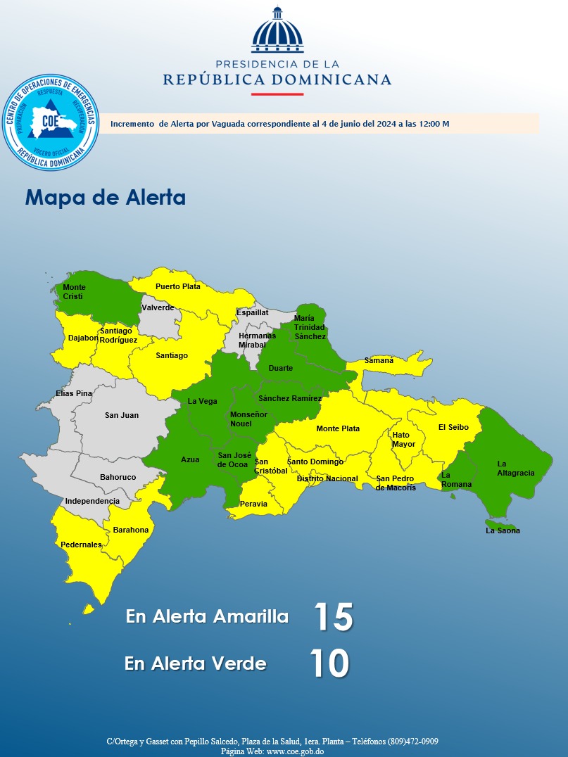 El COE informó el martes aumentó a 14 provincias y al Distrito Nacional en alerta amarilla y mantiene otras 10 en alerta verde, debido a que seguirá una masa de aire húmeda dejada por la onda tropical que ha salido nuestra áreas de pronósticos.