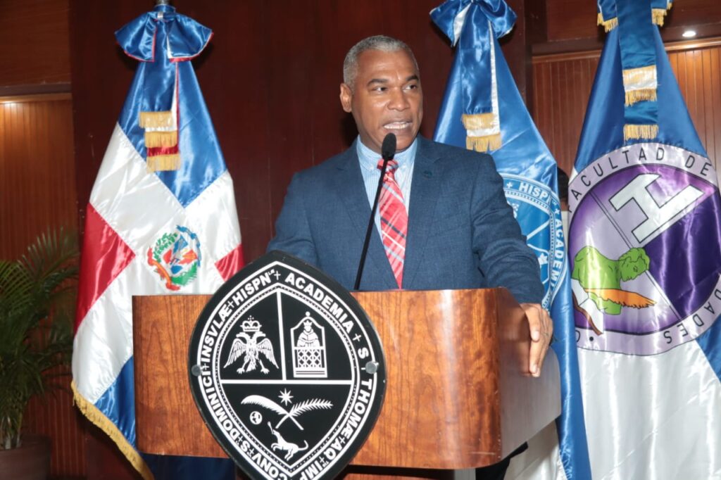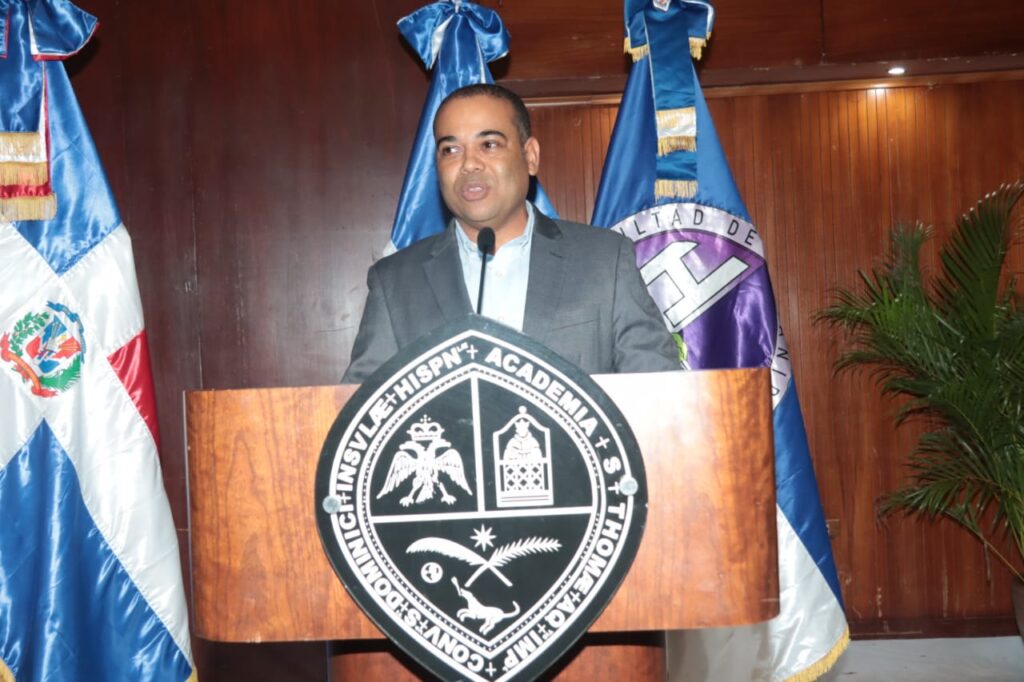 El decano de la Facultad de Humanidades, maestro Gerardo Roa se dirige a los presentes en el acto de graduación de los cursos extracurriculares de idiomas que organiza la Escuela de Idiomas de la UASD.