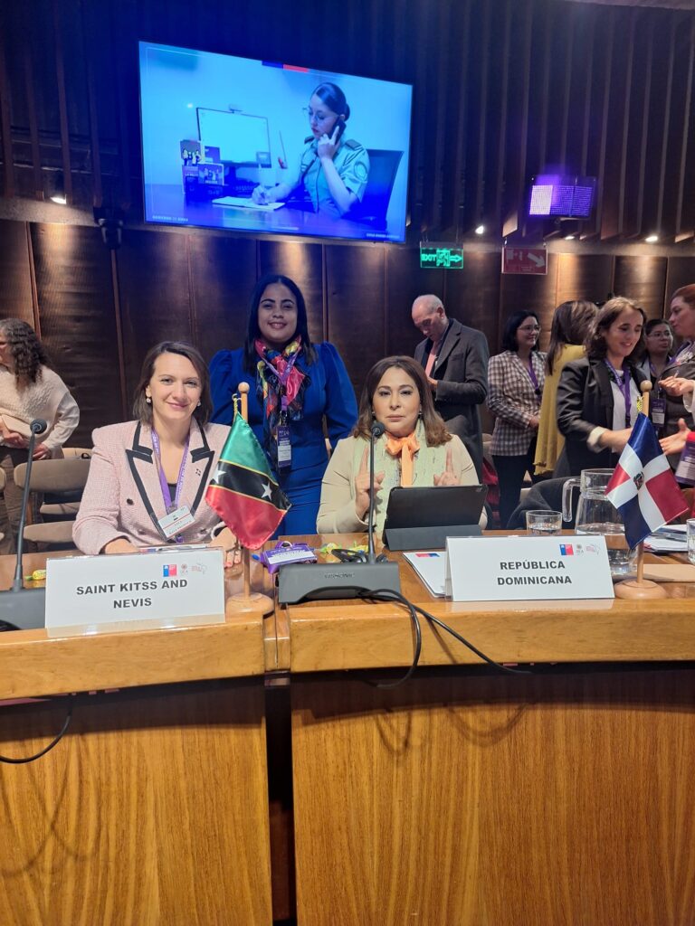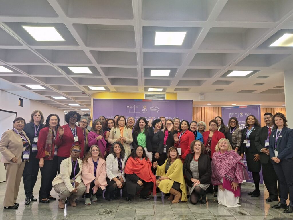 Chile. La ministra de la Mujer, Mayra Jiménez encabezó la delegación país junto a Jesica Croce, directora de Prevención y Atención a la Violencia de Género e Intrafamiliar; Odennys Anabel Jiménez Tejada, encargada de la Oficina Provincial de Valverde Mao, del Ministerio de la Mujer; y la doctora Yildalina Tatem, experta país en el Comité de Expertas del MESECVI, para participar en la novena Conferencia de Estados Parte en el marco de la conmemoración de los 30 años del Mecanismo de Seguimiento de la Convención Belém do Pará.