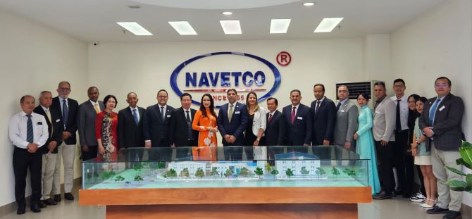 Le acompañan el embajador dominicano en Vietnam, Jaime Francisco Rodríguez; el viceministro de Desarrollo Tecnológico de Agricultura, Rafael Ortíz Quezada, varios auxiliares de la embajada dominicana y una delegación vietnamita.