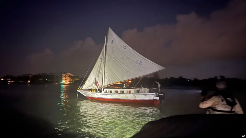 En esta foto proporcionada por la Oficina del Sheriff del Condado de Monroe, se muestra un velero que transporta a un grupo de más de 100 migrantes procedentes de Haití después de que llegaran a Key West, Florida, a primera hora del miércoles 26 de junio de 2024.