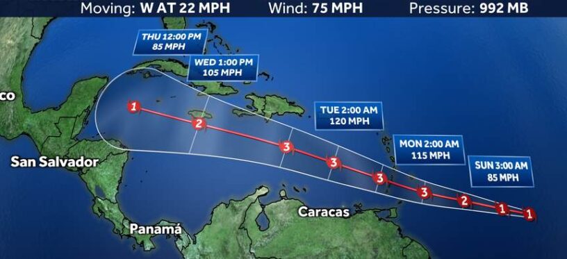 El Centro Nacional de Huracanes de Estados Unidos (CNH) reportó que el sistema se mueve hacia el oeste cerca de 35 kilómetros por hora y según la trayectoria prevista, Beryl estará sobre las Islas de Barlovento mañana por la noche y el lunes.