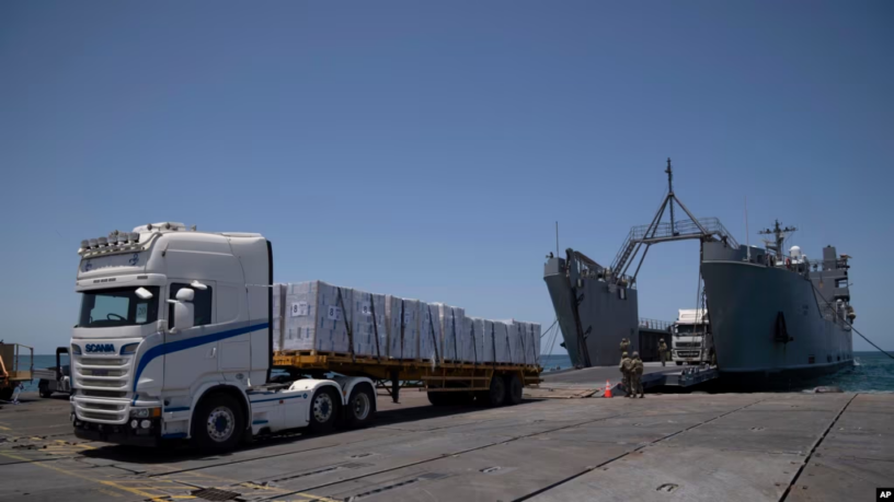 Es la primera vez que salen camiones con ayuda para Gaza del muelle flotante desde que el Programa Mundial de Alimentos de la ONU suspendió sus operaciones allí por motivos de seguridad el 9 de junio.