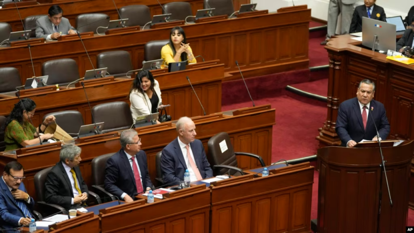 ARCHIVO – El primer ministro Gustavo Adrianzen, a la derecha, pide un voto de confianza en el Congreso en Lima, Perú, el miércoles 3 de abril de 2024.