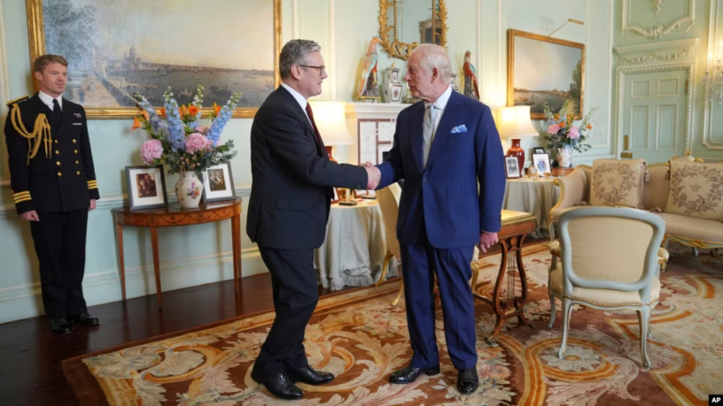 El rey Carlos III de Gran Bretaña (derecha) estrecha la mano de Keir Starmer, a quien invitó a convertirse en primer ministro y a formar un nuevo gobierno, tras la aplastante victoria del Partido Laborista en las elecciones generales, en Londres, el viernes 5 de julio de 2024.