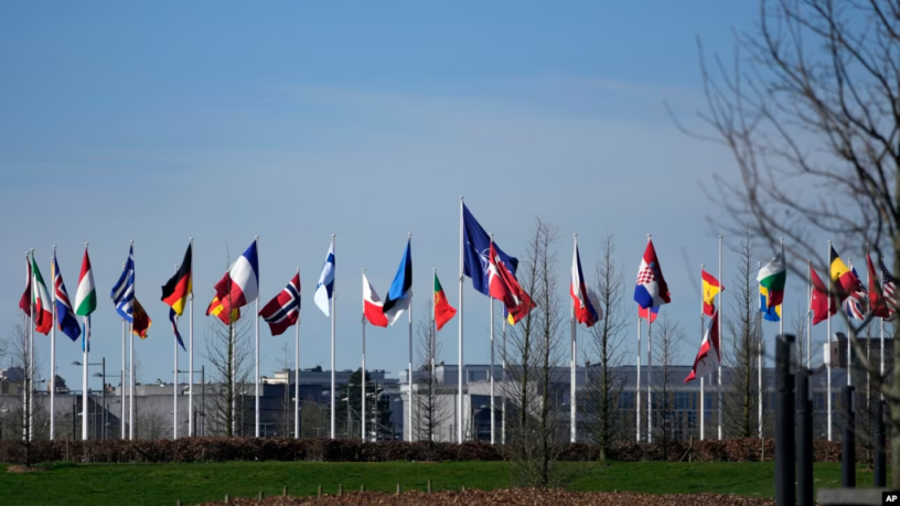 ARCHIVO – Banderas de los países miembros de la OTAN ondean al viento afuera en la sede de la OTAN en Bruselas, el 14 de marzo de 2024.