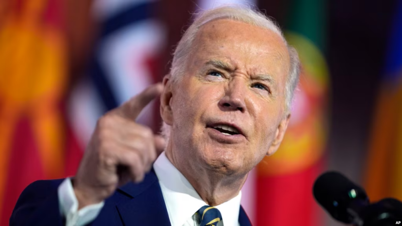 El presidente Joe Biden pronuncia un discurso sobre el septuagésimo quinto aniversario de la OTAN en el Auditorio Andrew W. Mellon, el 9 de julio de 2024, en Washington.