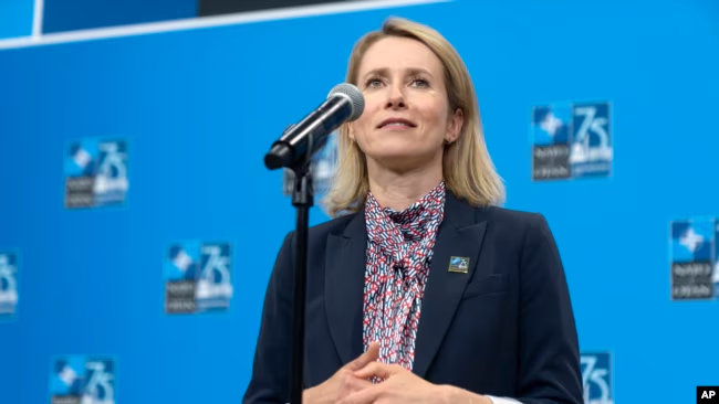 La primera ministra de Estonia, Kaja Kallas, habla durante su llegada a la cumbre de la OTAN en Washington, el jueves 11 de julio de 2024.