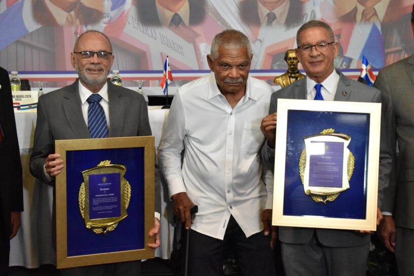 Wilson Gómez entrega los reconocimientos al ex pelotero Felipe Rojas Alou y al director de El Caribe, Nelson Rodríguez.
