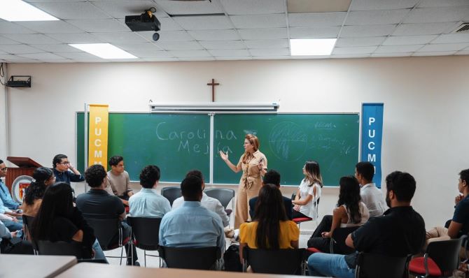 Santo Domingo, R. D., 20 de julio, 2024.- Al participar en un encuentro con estudiantes y académicos de la Pontificia Universidad Católica Madre y Maestra, la alcaldesa Carolina Mejía afirmó que no se hacen políticas públicas lejos de la necesidad del pueblo.