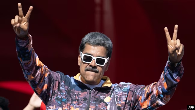 El presidente Nicolás Maduro hace señales de victoria durante un mitin en Caracas, el 18 de julio de 2024.