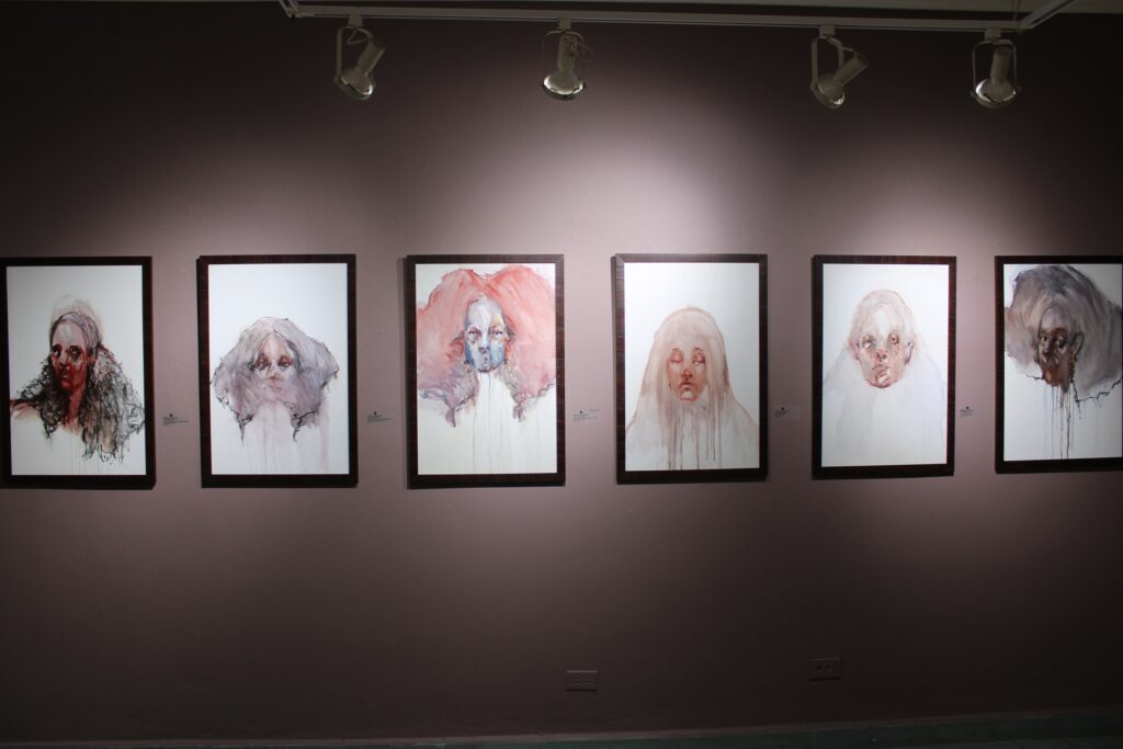 La curaduría de esta exposición estuvo a cargo de María del Carmen Ossaye y Juan Carlos Ditrén Flores. “A través de la figuración, la artista propone una serie de trabajos que exploran psicológicamente el autorretrato, la forma, lo femenino y lo andrógeno. Por ello representa figuras reconocibles, que pueden ser identificadas sin necesidad de emplear la palabra, escritas ni verbalizadas; y en ese proceso creativo, preserva el fondo blanco, que proviene del color natural del soporte, como una manifestación de que no existe miedo a la otredad. Más bien, la enfrenta con un lenguaje artístico sobrio que muestra retratos femeninos de ojos definidos, y otros rasgos no tan definidos”, precisó Ditrén sobre la muestra.