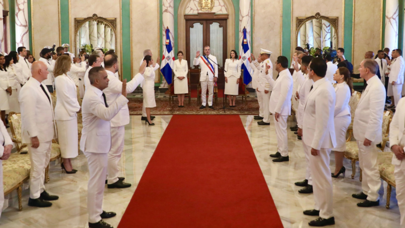 El jefe de Estado, acompañado de la primera dama Raquel Arbaje y de la vicepresidenta Raquel Peña, tomó el juramento de los funcionarios, en un acto realizado en el Salón de Embajadores del Palacio Nacional, luego de ser investido con la banda presidencial en el Teatro Nacional Eduardo Brito, que fungió como Asamblea Nacional.