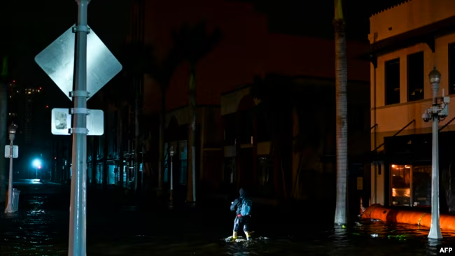 Un hombre toma fotografías y videos mientras camina por calles inundadas por las aguas después de que el huracán Milton tocó tierra en Fort Myers, Florida, el 9 de octubre de 2024.