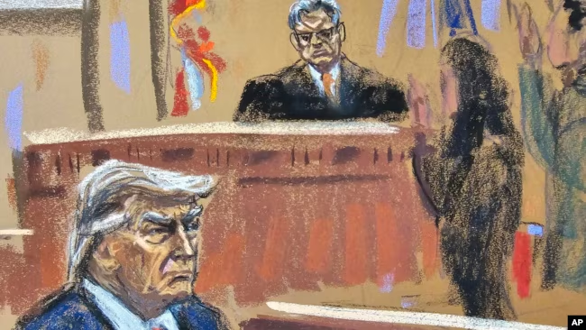 ARCHIVO – Donald Trump se sienta mientras los jurados finales toman juramento durante su juicio penal por cargos de falsificación de registros comerciales en el tribunal estatal de Manhattan en Nueva York, el 19 de abril de 2024, en este boceto de la sala del tribunal.