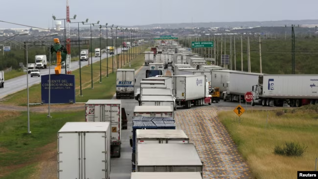 ARCHIVO – Camiones esperan en una larga fila para el control aduanero fronterizo para cruzar a EEUU en el Puente del Comercio Mundial en Nuevo Laredo, México, el 2 de noviembre de 2016.