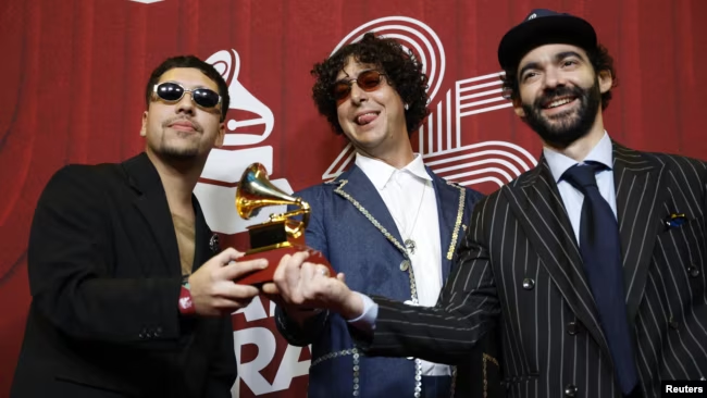 ARCHIVO – La banda musical venezolana Rawayana posa con su premio Latin Grammy a la mejor canción pop, «Feriado», en Miami, Estados Unidos, el 14 de noviembre de 2024.