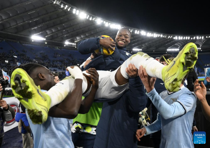 ROMA, 6 diciembre, 2024 (Xinhua) — Imagen del 5 de diciembre de 2024 de Tijjani Noslin (arriba), de Lazio, festejando con sus compañeros al término del partido de octavos de final de la Copa Italia entre Lazio y Napoli, en Roma, Italia. (Xinhua/Alberto Lingria)