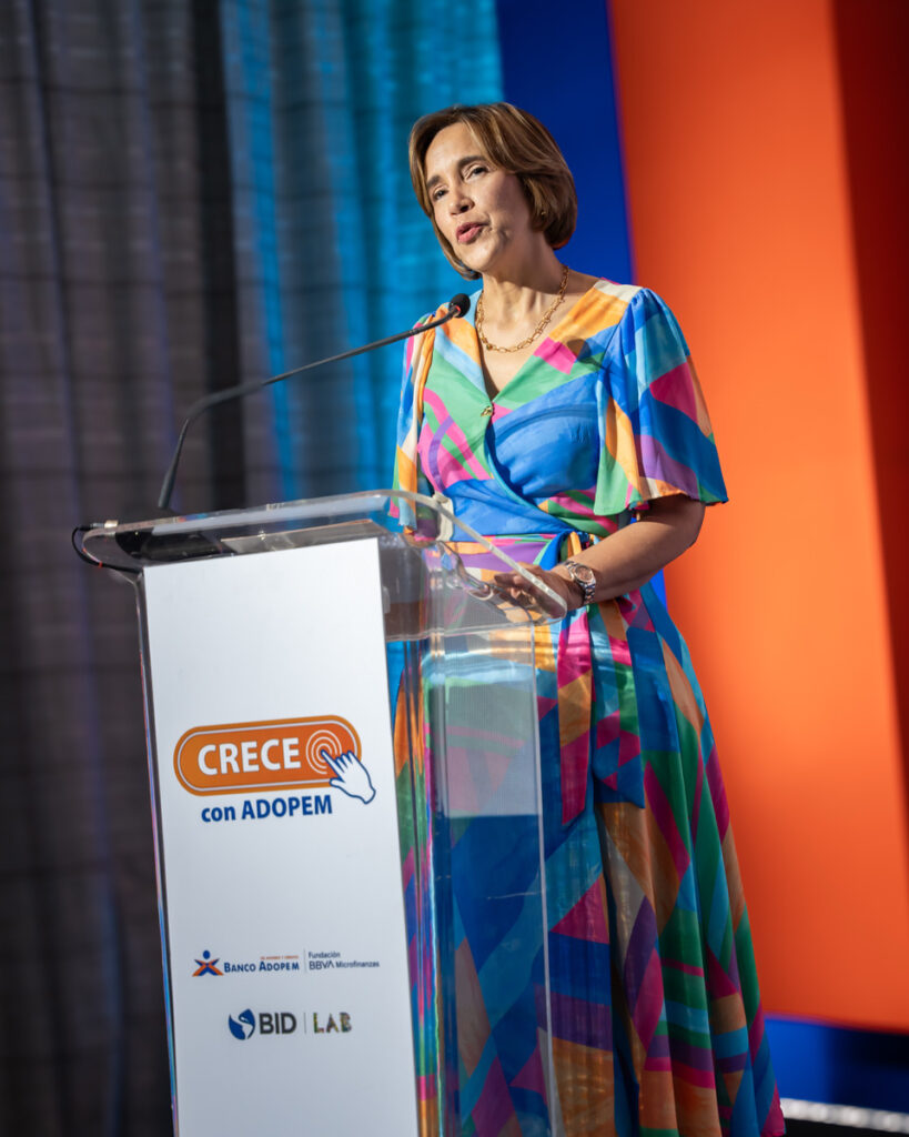 Mercedes Canalda de Beras-Goico, presidenta ejecutiva del Banco Adopem, entidad de la Fundación Microfinanzas BBVA, explicó que este proyecto reduce la brecha digital y crea oportunidades económicas para mujeres emprendedoras, con una plataforma educativa innovadora.