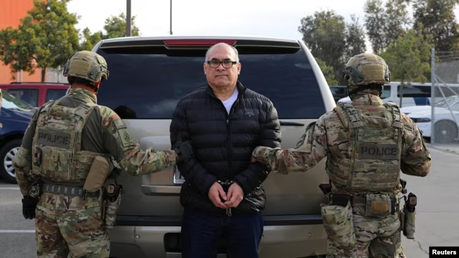 Oficiales de policía del Servicio de Inmigración y Control de Aduanas de Estados Unidos sostienen al capo de la droga Osiel Cárdenas Guillén, quien fue deportado y entregado a las autoridades mexicanas en Tijuana el 16 de diciembre de 2024