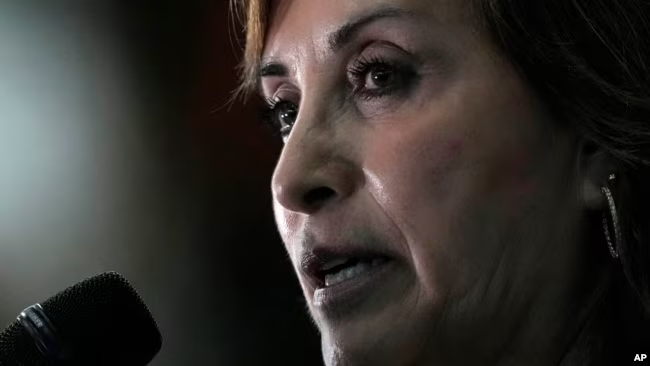 ARCHIVO – La presidenta de Perú, Dina Boluarte, habla con la prensa al final de la Cumbre de la Amazonía en Belem, Brasil, el 8 de agosto de 2023.