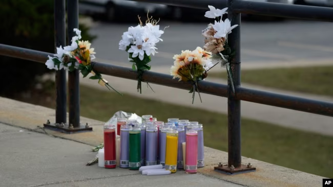 Flores y velas colocadas en el exterior de la escuela Abundant Life después de un tiroteo, en Madison, Wisconsin, el 17 de diciembre de 2024.