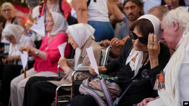Taty Almeida, segunda a la derecha, integrante de Madres de Plaza de Mayo, se suma a una protesta frente a la Secretaría de Derechos Humanos contra los despidos del gobierno de Javier Milei, en Buenos Aires, Argentina, el viernes 27 de diciembre de 2024.