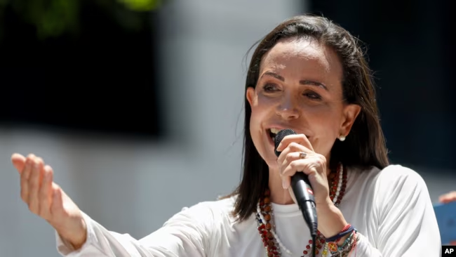 ARCHIVO – María Corina Machado, dirigente opositora venezolana, habla durante una manifestación política en Caracas, el 28 de agosto de 2024.