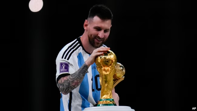 ARCHIVO – Emocionado, el argentino Lionel Messi acaricia el trofeo al mejor jugador de la Copa del Mundo después del partido final del torneo de fútbol entre Argentina y Francia en el Estadio Lusail en Lusail, Qatar, el 18 de diciembre de 2022.