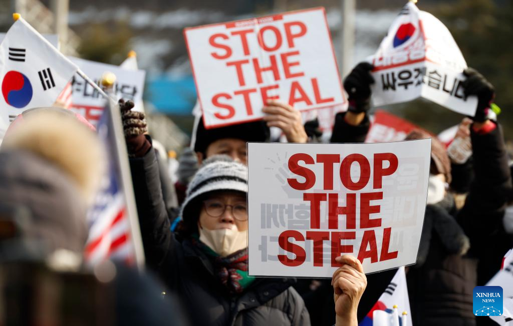Simpatizantes del arrestado presidente surcoreano, Yoon Suk-yeol, se reúnen frente al Centro de Detención de Seúl, en Uiwang, República de Corea, el 16 de enero de 2025. Un tribunal de la República de Corea rechazó la solicitud de liberación del presidente arrestado Yoon Suk-yeol, informaron el jueves diversos medios de comunicación. (Xinhua/Jun Hyosang)