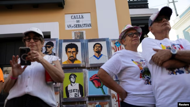 Personas observan retratos pintados a mano de Bad Bunny y Roberto Clemente que están a la venta, durante la inauguración de la 55a edición del Festival Anual de la Calle San Sebastián en el Viejo San Juan, Puerto Rico, el 16 de enero de 2025.