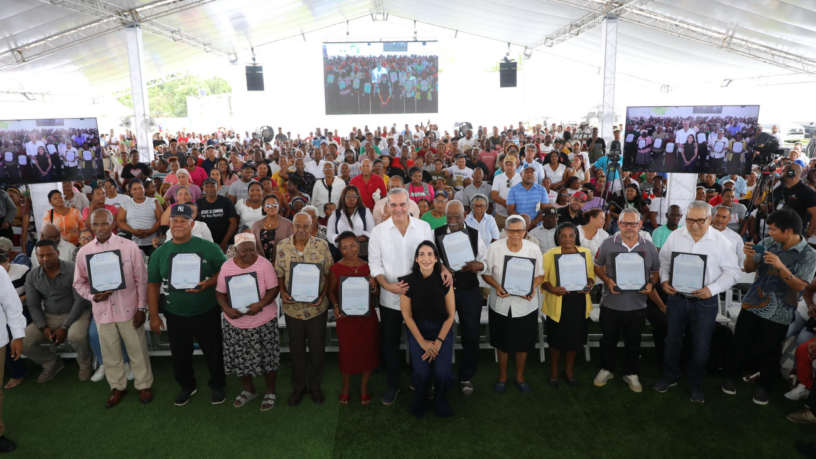 Santo Domingo Oeste, RD.- El presidente Luis Abinader, junto con la primera dama Raquel Arbaje, entregó el domingo, en el Batey Palavé, 708 títulos de propiedad que beneficiarán a 2,832 personas, lo que representa estabilidad, paz y seguridad jurídica para los beneficiarios.