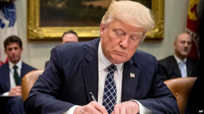 ARCHIVO – El presidente Donald Trump firma una orden ejecutiva en el Salón Roosevelt de la Casa Blanca en Washington, el 25 de abril de 2017.