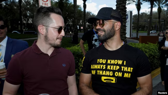 ARCHIVO – Enrique Tarrio (der.), líder de los Proud Boys, junto a un hombre no identificado, a las afueras de la Conferencia de Acción Política Conservadora (CPAC, en inglés) en Orlando, Florida, EEUU, el 27 de febrero de 2021. REUTERS/Octavio Jones.
