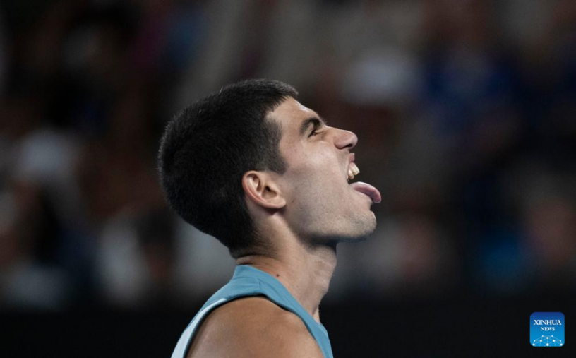 MELBOURNE, 21 enero, 2025 (Xinhua) — Carlos Alcaraz reacciona durante el partido de cuartos de final de individuales masculinos entre Novak Djokovic, de Serbia y Carlos Alcaraz, de España, en el torneo de tenis Abierto de Australia, en Melbourne, Australia, el 21 de enero de 2025. (Xinhua/Lui Siu Wai)