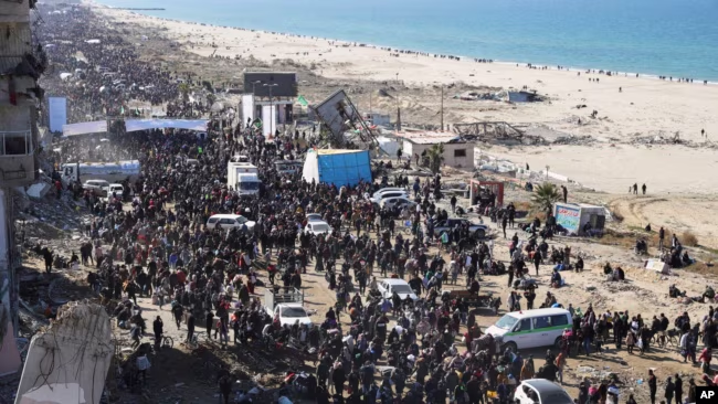 Palestinos desplazados regresas a sus hogares en el norte de la Franja de Gaza el 27 de enero de 2025.