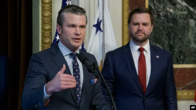 ARCHIVO – Pete Hegseth habla después de ser juramentado como Secretario de Defensa por el vicepresidente JD Vance en la Sala del Tratado Indio del Edificio de la Oficina Ejecutiva Eisenhower en el campus de la Casa Blanca en Washington, el 25 de enero de 2025.