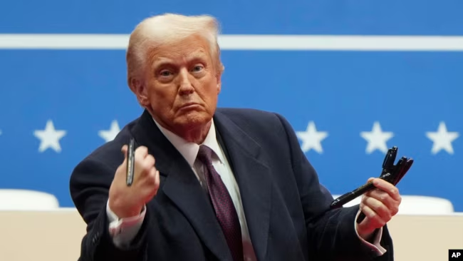El presidente Donald Trump arroja bolígrafos utilizados para firmar órdenes ejecutivas a la multitud en Washington, el lunes 20 de enero de 2025.
