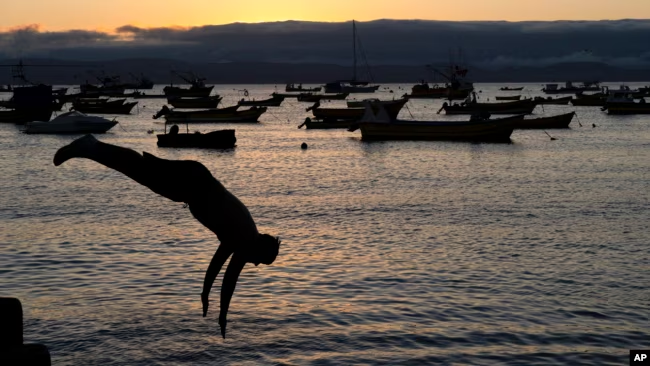 Un hombre se lanza desde un muelle al atardecer en Tongoy, Chile, el martes 21 de enero de 2025.