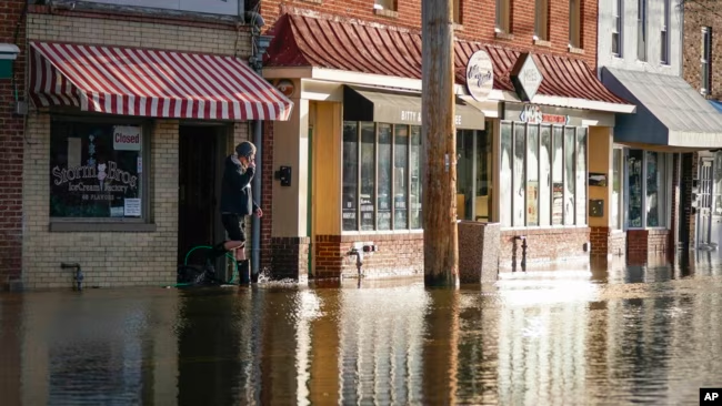 ARCHIVO – Un empleado de la fábrica de helados Storm Ice Cream Factory inspecciona los daños causados por una tormenta invernal que dejó más de 60 centímetros de agua en varios negocios del centro de Annapolis, Maryland, el miércoles 10 de enero de 2024.