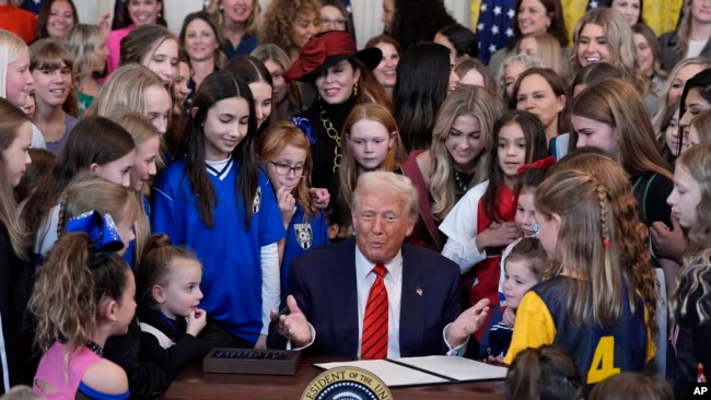 El presidente Donald Trump firma un decreto que prohíbe a las atletas transgénero femeninas competir en eventos deportivos femeninos o de niñas, el 5 de febrero de 2025, en la Casa Blanca, Washington.