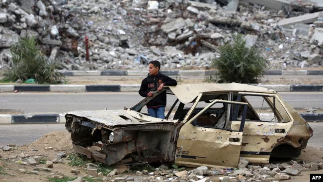 En la toma se ve a un niño palestino en los restos de un automóvil, en el campo de refugiados de Bureij, en el centro de la Franja de Gaza, el 7 de febrero de 2025.