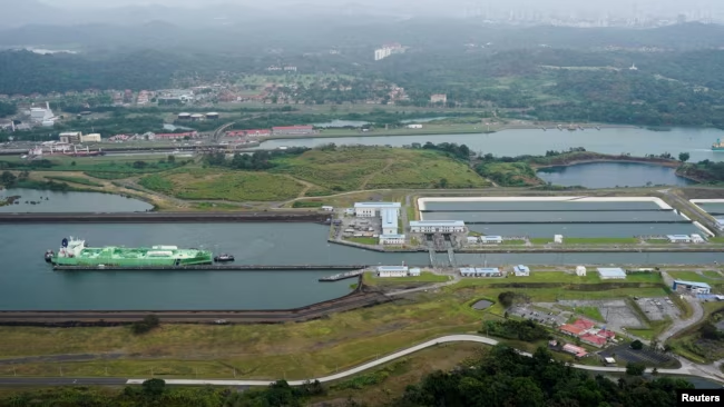 Una vista aérea muestra un buque de carga transitando por las esclusas de Agua Clara en el Canal de Panamá, en Colón, Panamá, el 1 de febrero de 2025.