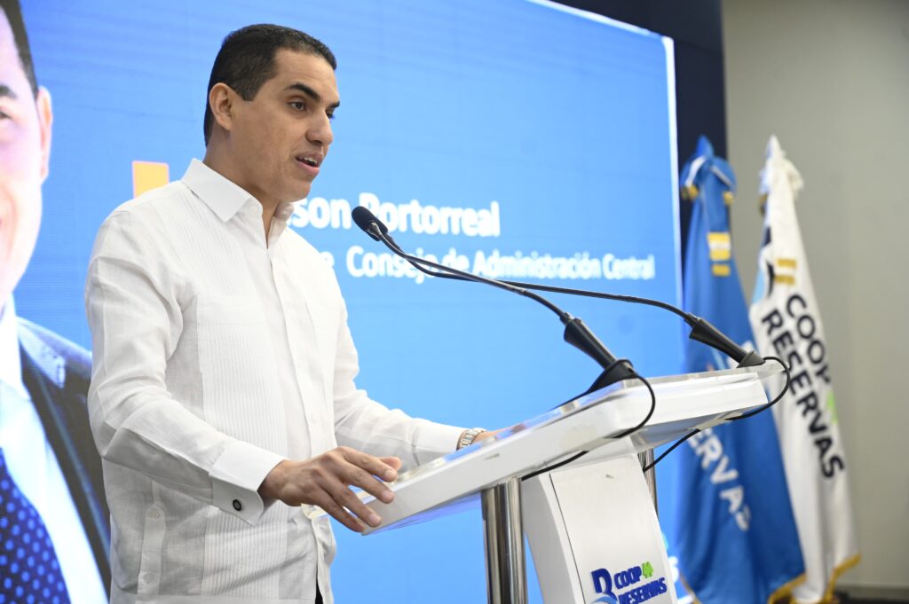 El presidente de la Cooperativa Reservas, Robinson Portorreal, habla en la inauguración del edificio CoopReservas.