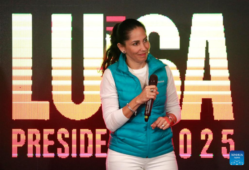 La candidata a la Presidencia de Ecuador, Luisa González, por el partido Movimiento Revolución Ciudadana, participa durante una conferencia de prensa al término de las elecciones presidenciales y legislativas, en Quito, Ecuador, el 9 de febrero de 2025. El presidente ecuatoriano y candidato a la reelección, Daniel Noboa, y Luisa González pasarían a una segunda vuelta presidencial en Ecuador, escrutado el 69 por ciento de actas de la primera vuelta celebrada este domingo, según los resultados oficiales difundidos por el Consejo Nacional Electoral. (Xinhua/Ricardo Landeta)