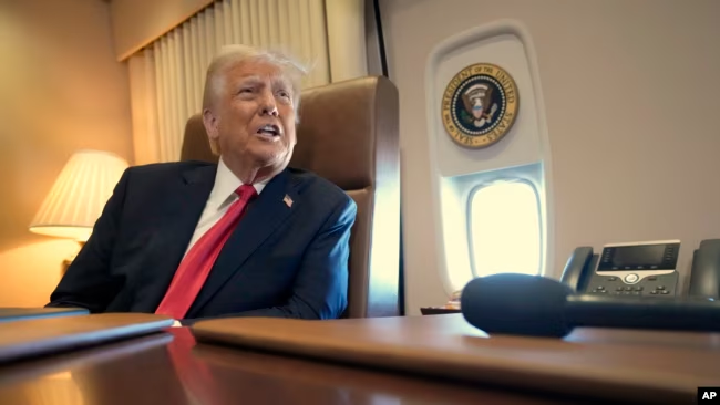 El presidente Donald Trump habla con periodistas a bordo del Air Force One mientras viaja desde West Palm Beach, Florida, a Nueva Orleans, Luisiana, el 9 de febrero de 2025.