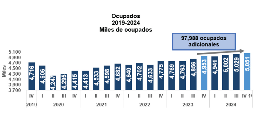 - La encuesta del mercado laboral del Banco Central arrojó que se generaron 97,988 nuevos puestos de trabajo respecto a octubre-diciembre de 2023, situando el total de ocupados en 5,050,930 trabajadores en octubre-diciembre de 2024.